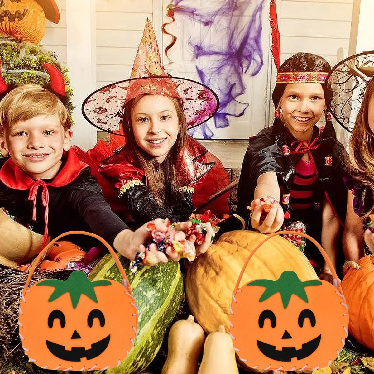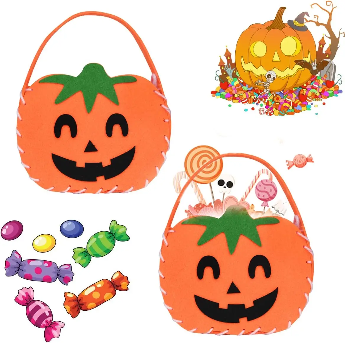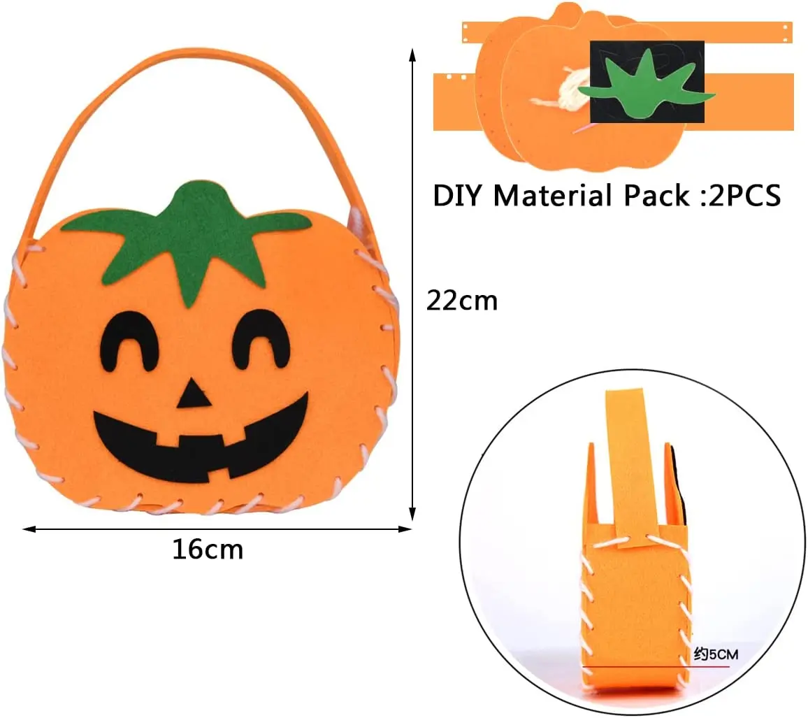 Cestas de regalo de dulces de calabaza de fieltro para Halloween, adornos de disfraces de Halloween, bolsas de botín de truco o trato con temática de Halloween