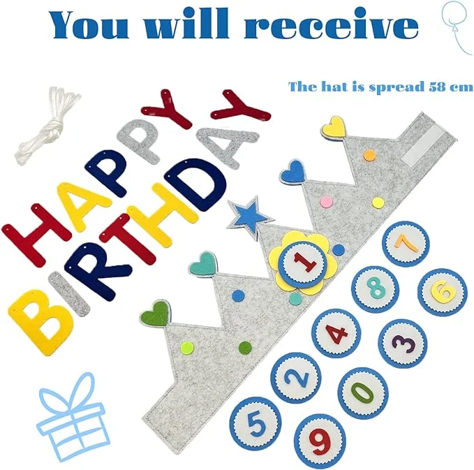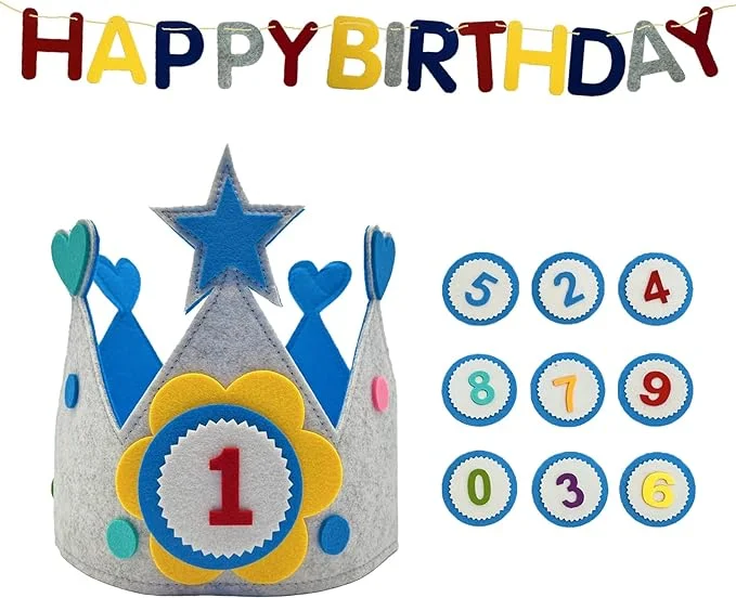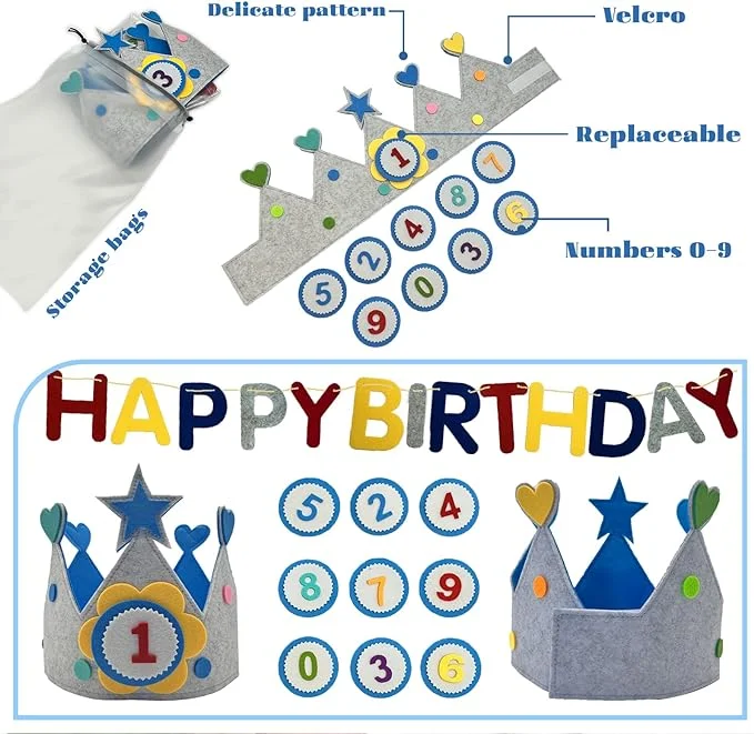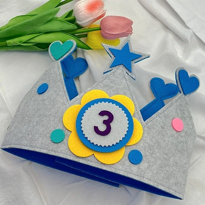 Sombrero de fiesta de cumpleaños para niños con número 10 de fieltro redondo y corazón azul personalizado de venta caliente con bandera de velcro ajustable y bolsa de almacenamiento