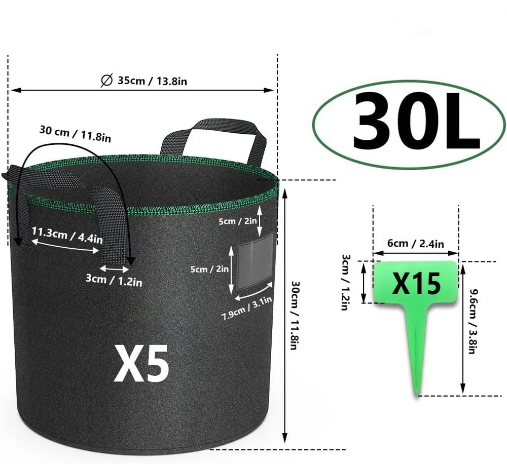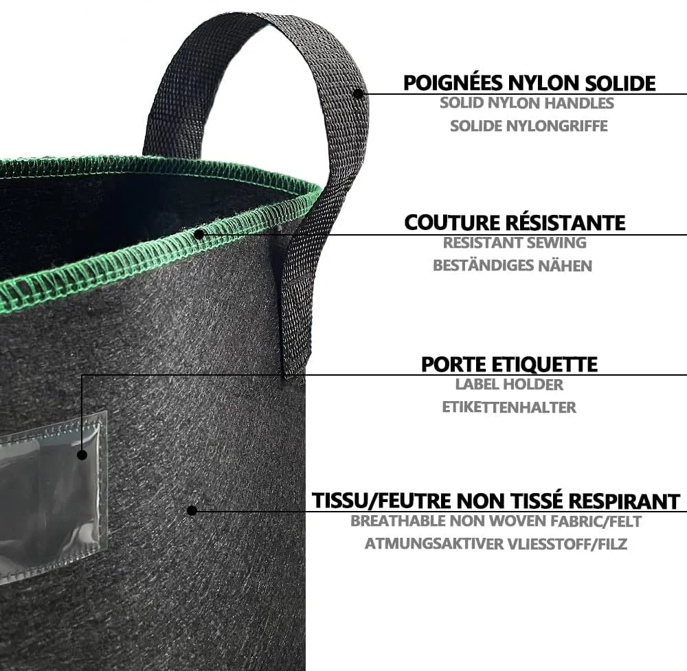 Artículo | Bolsa de tela no tejida negra, ligera y duradera, personalizada, con tapón para plantas para tomates, pepinos, patatas y fresas | ||||||