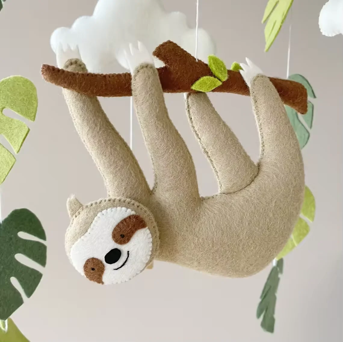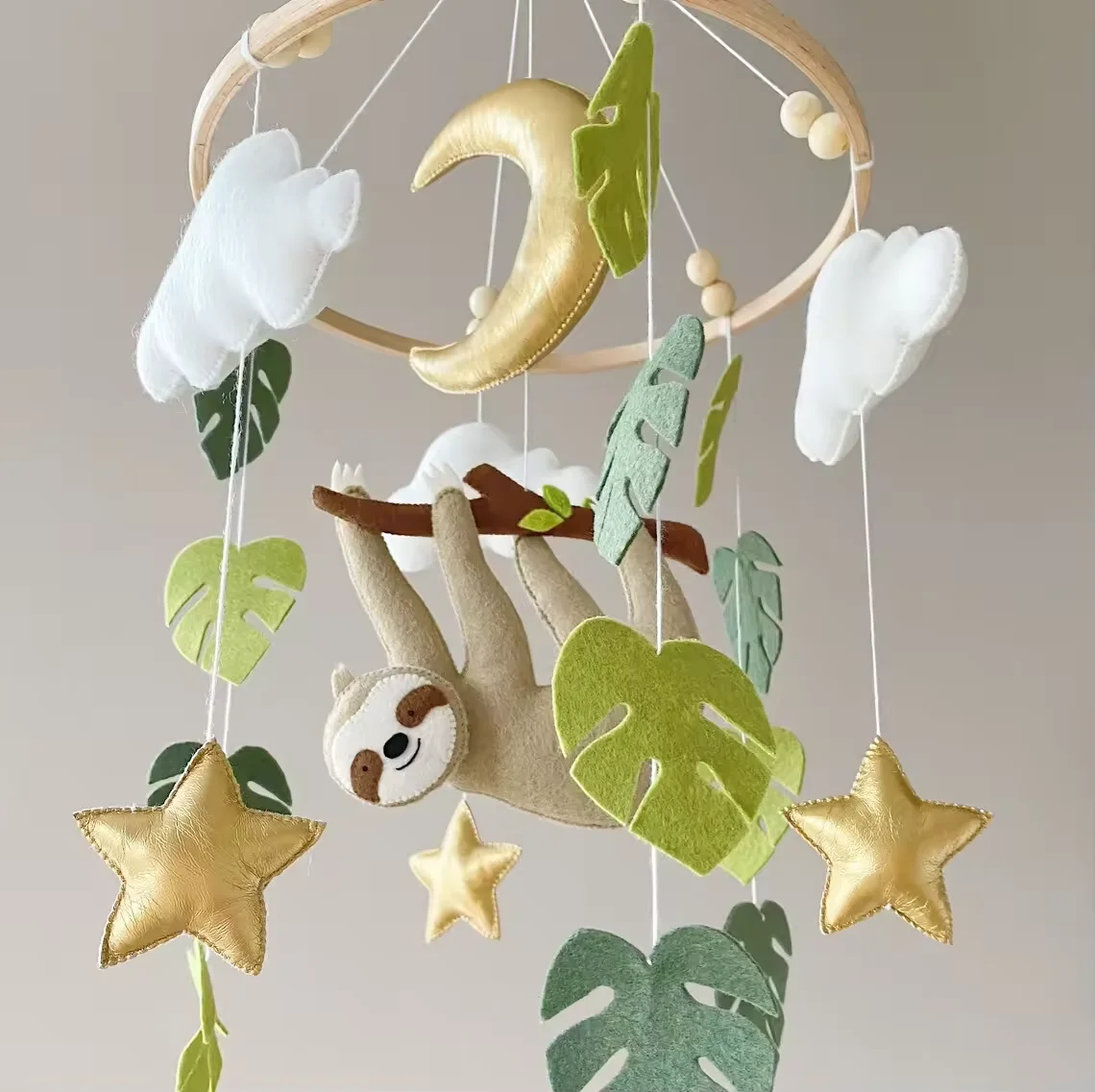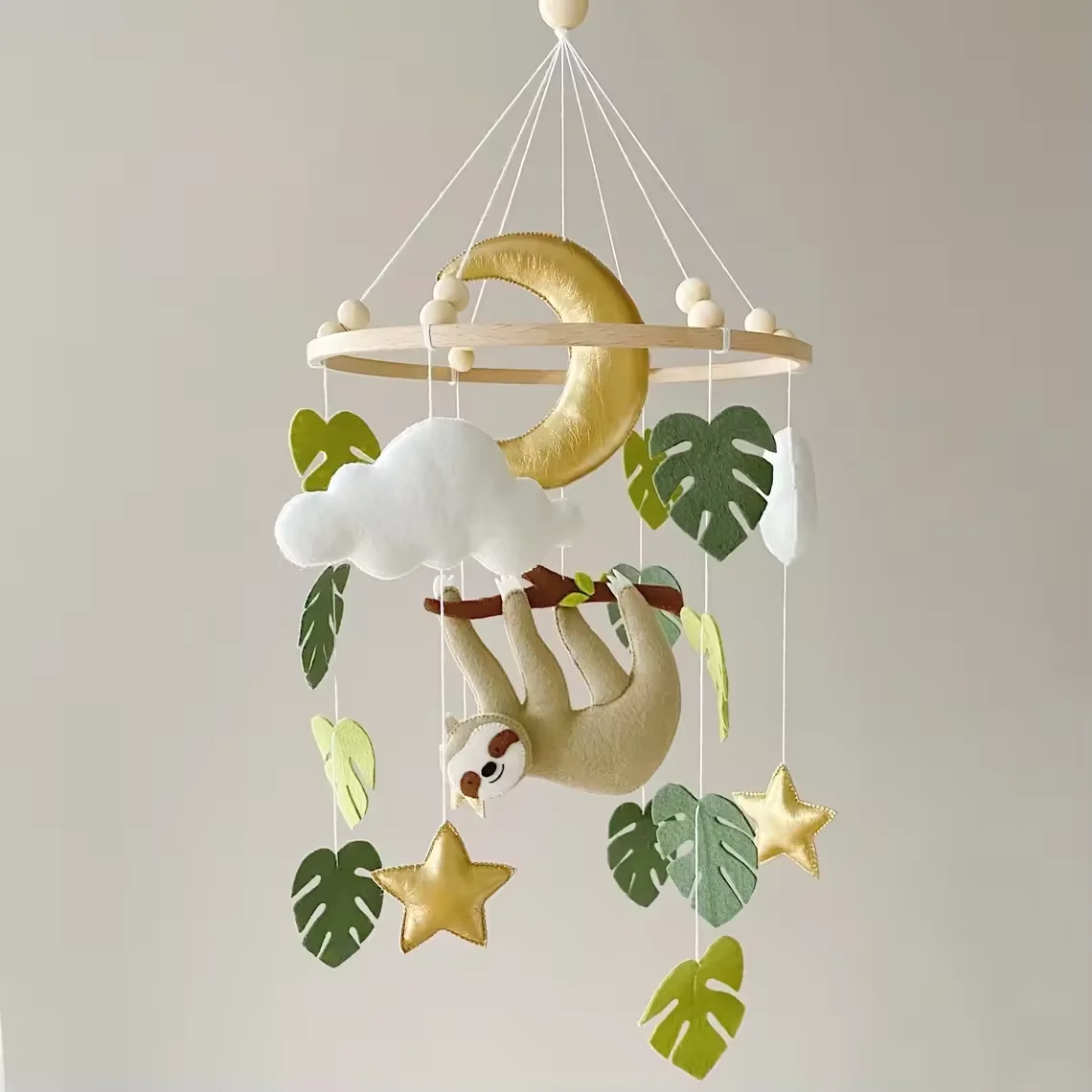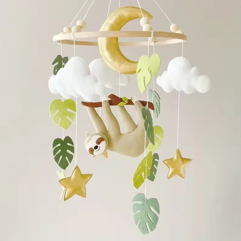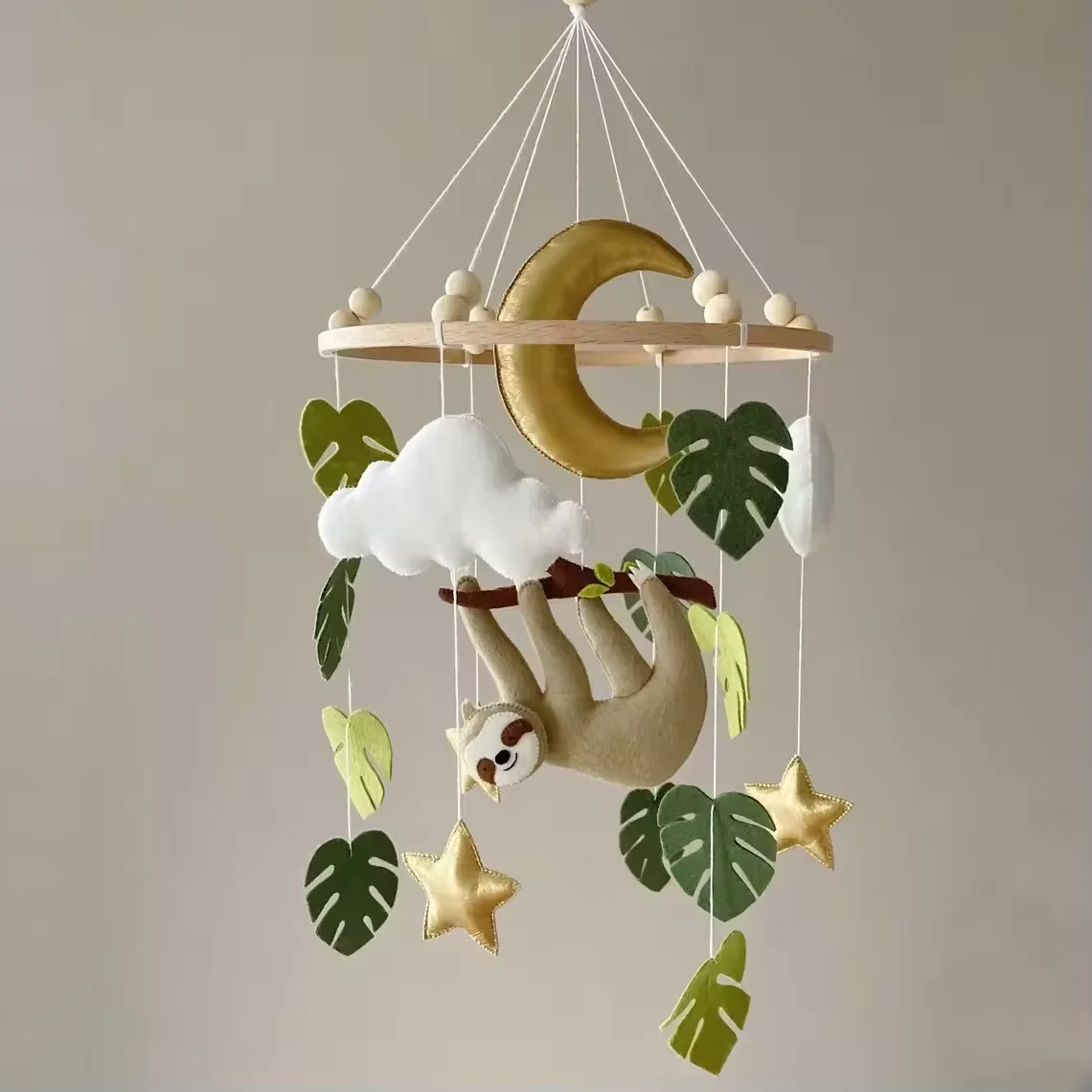 Venta al por mayor, móvil de cuna colgante bohemio con diseño de perezoso de fieltro, luna dorada, hojas verdes, regalo de cumpleaños para niños